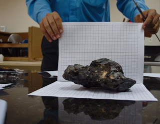 O astrônomo informou que o material achado mede 20.7cm X 13cm X 9cm e pesa 1,580 kg. O volume é de 2.423g/cm³.