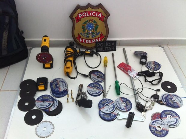 Segundo a PF, com os homens foram apreendidos uma arma de fogo, uma furadeira profissional, uma serra elétrica circular com vários discos e ferramentas. A suspeita da polícia é de que os homens usariam o material para arrombar o prédio e perfurar os cofres.