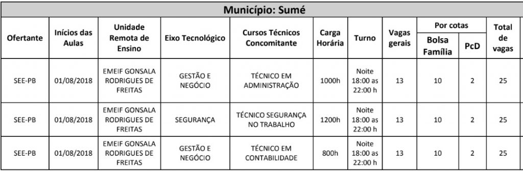 Em Sumé os cursos oferecidos serão os seguintes: técnico em administração; técnico em segurança do trabalho e técnico em contabilidade, sendo ofertadas 25 vagas para cada curso, distribuídas da seguinte maneira: