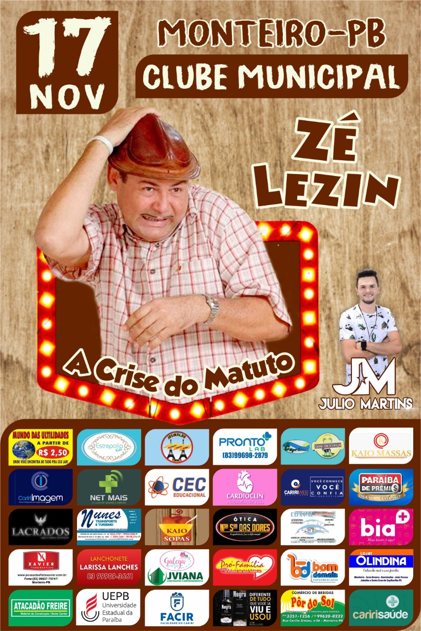 Conhecido pelo personagem Zé Lezin, o comediante paraibano Nairon Barreto volta a Monteiro, no Cariri paraibano, para apresentar o espetáculo “Operação Lava Mato”, neste sábado, dia 17. A apresentação ocorre no Clube Municipal, no centro de Monteiro, as 20h.