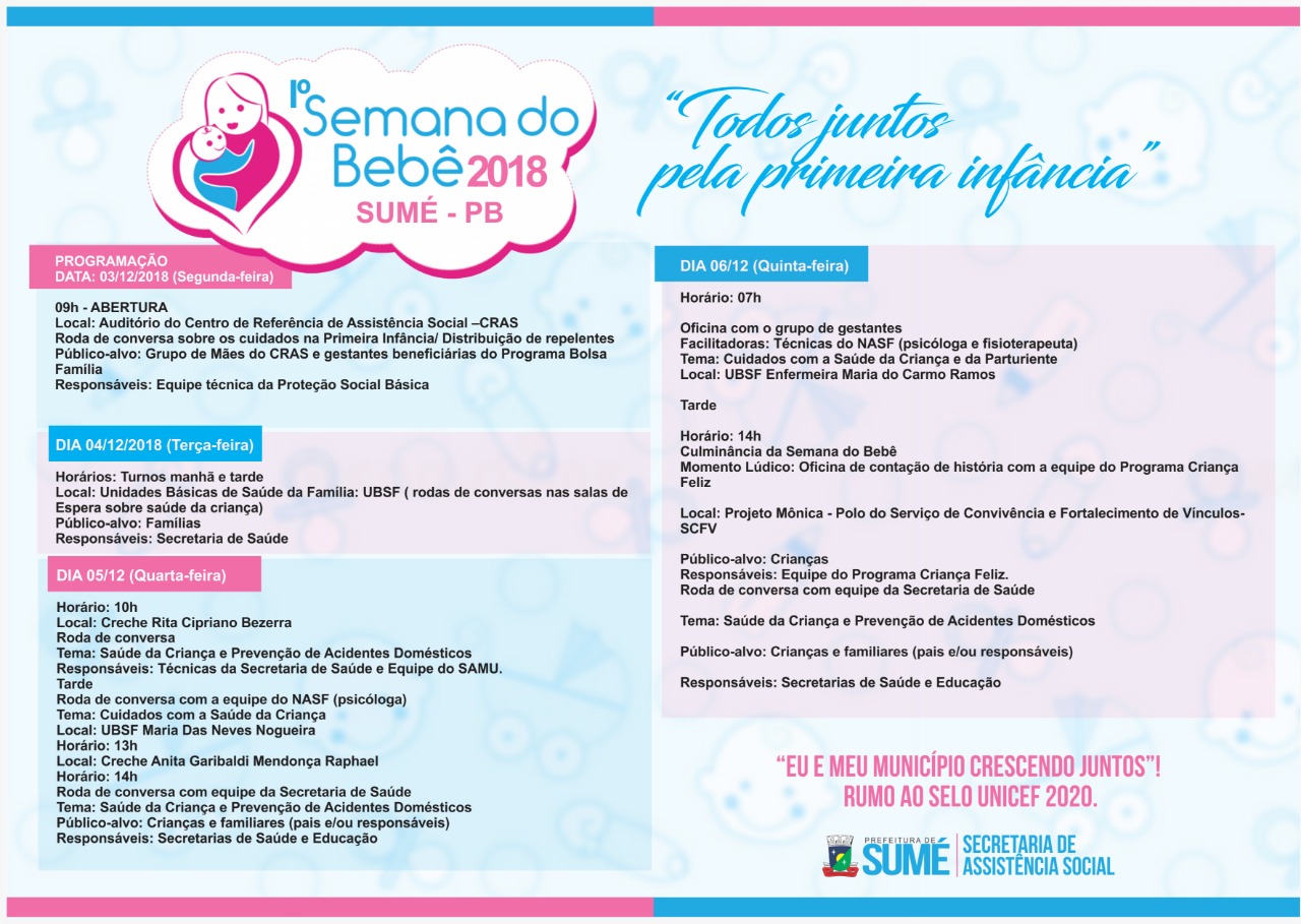 A Secretaria de Assistência Social de Sumé, realiza na próxima semana a Primeira Semana do Bebê, cujo tema é “Todos juntos pela primeira infância”.