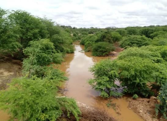 O Rio que conta a cidade amanheceu com uma forte enchente, que segue para o Açude de Santo Antônio.