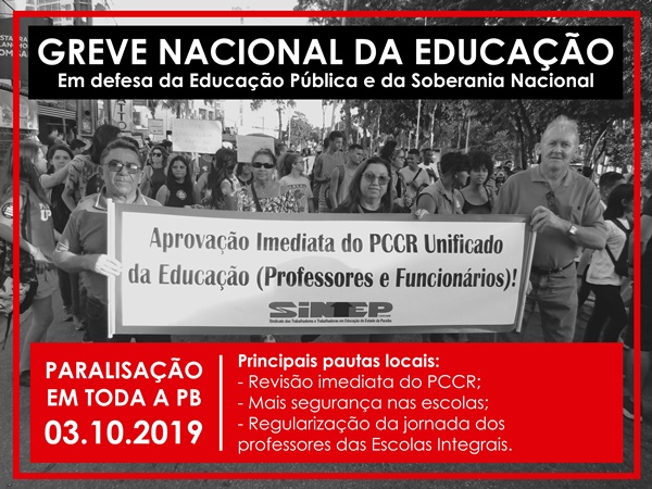 Os trabalhadores da educação do Estado da Paraíba paralisam as atividades, nesta quinta-feira (3), como parte da Greve Nacional da Educação. De acordo com os apoiadores do movimento, a greve é uma resposta aos ataques sofridos pela categoria desde o início do Governo Bolsonaro.