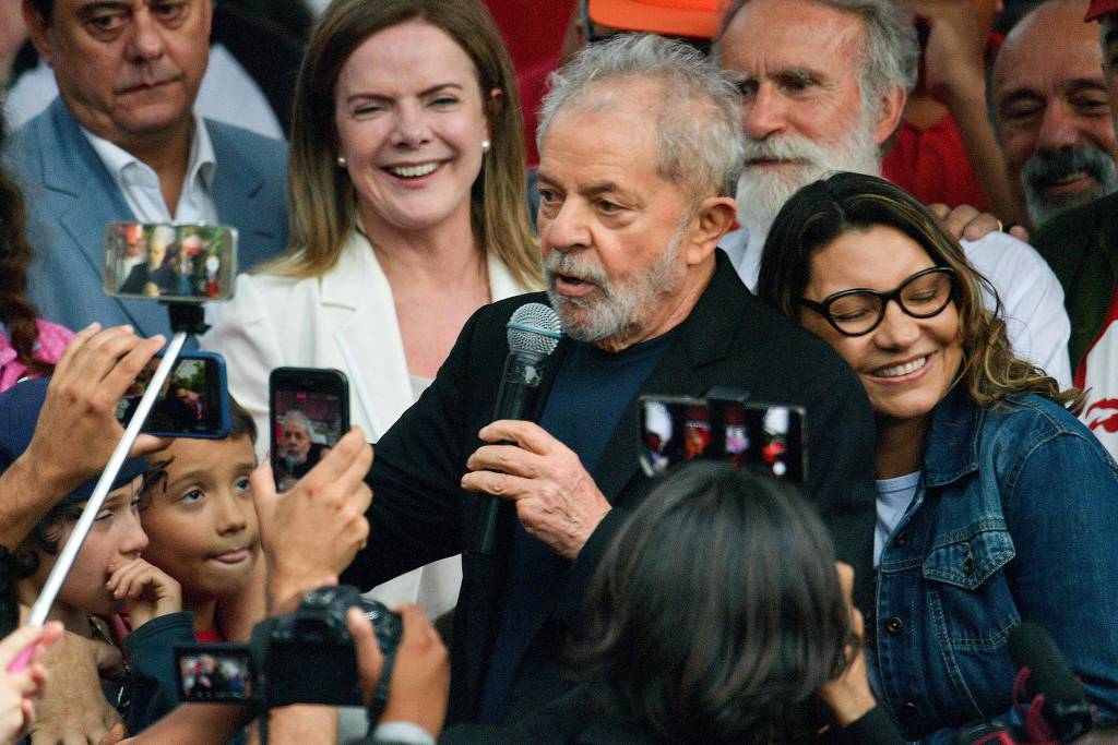 Ele – que estava preso desde 7 de abril de 2018 na Superintendência da Polícia Federal (PF) – saiu do local por volta das 17h40 e fez um discurso no qual agradeceu a militantes que ficaram em vigília por 580 dias, dizendo que eles eram “o alimento da democracia que eu precisava para resistir à canalhice que lado podre do Estado brasileiro, da Justiça, do Ministério Público, da Polícia Federal e da Receita Federal”.
