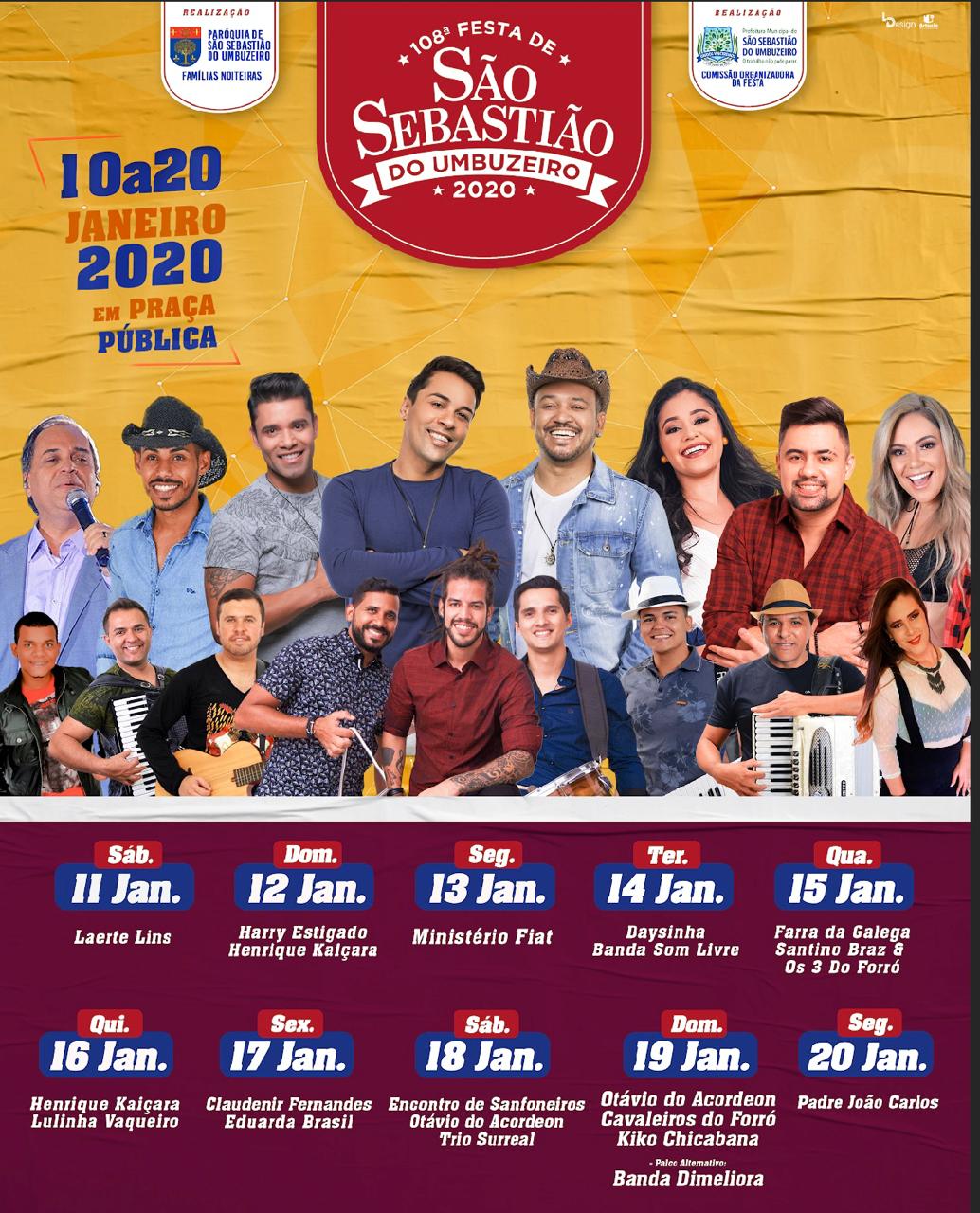 Cariri Notícias 108° Festa do Padroeiro de São Sebastião do Umbuzeiro começa no próximo sábado Redação06/01/20200183 views Ministério Vozes da Missão e Duda & Kinha