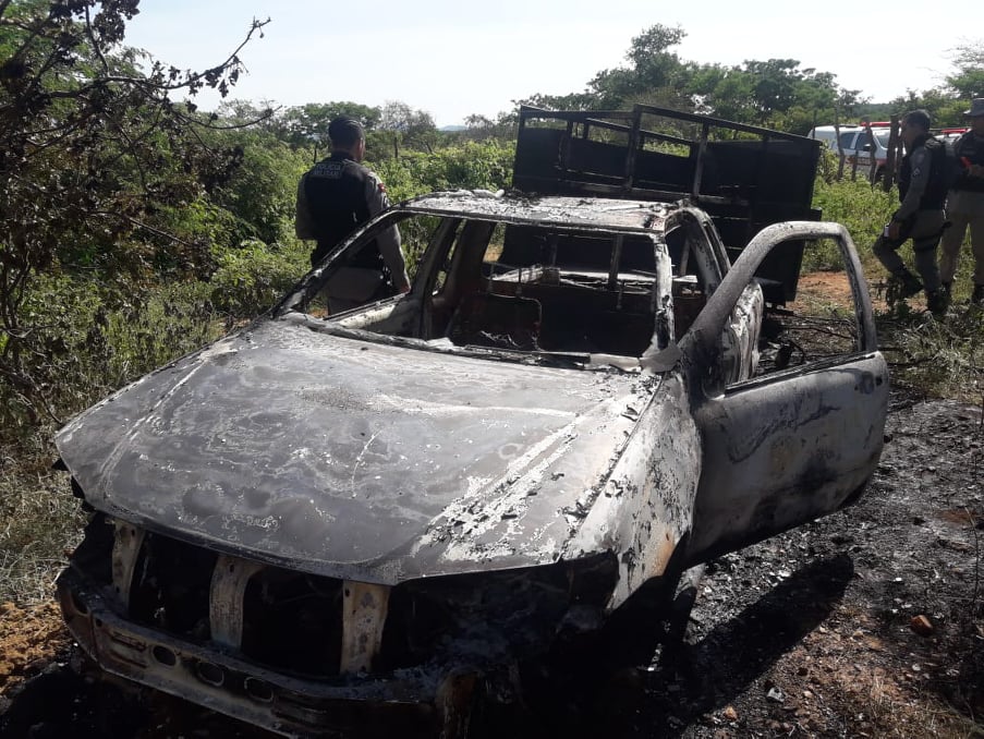 Poucos mais de 5km do local onde foi encontrado o corpo, a Polícia localizou um veículo do tipo Strada e um reboque totalmente incendiados.